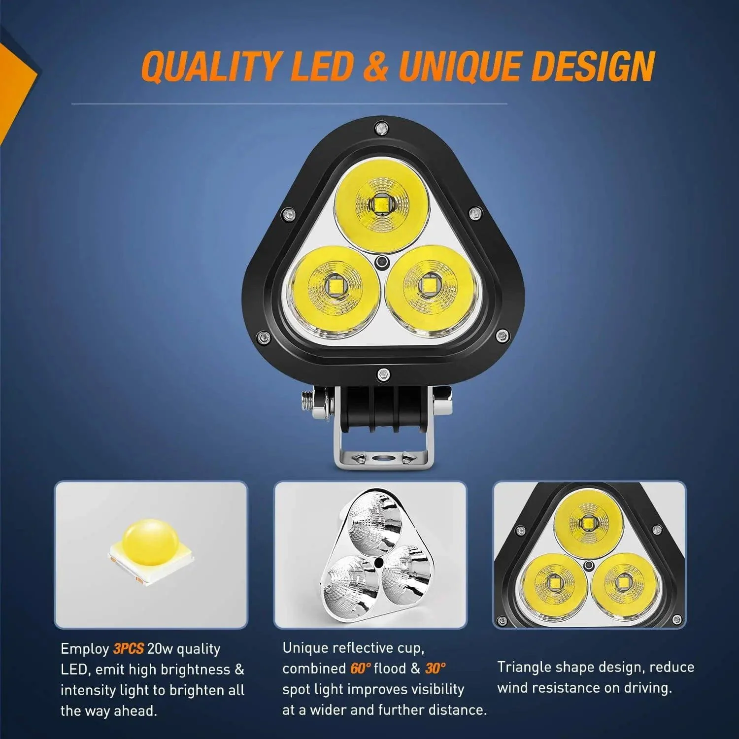 Unique Combo Beam Design: Features unique reflective cups that combine 60°flood light and 30° spotlight, helping improve visibility at a maximum broader and further distance. Ideal bright light, no more darkness!
