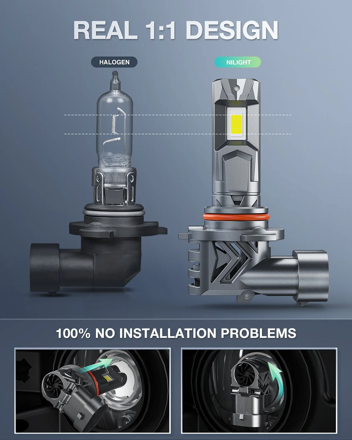 - True 1:1 Mini Size: 100% no installation problems. Nilight 9005/HB3 bulbs are designed with 1:1 size with halogen bulbs, no bulky bulb base and extra driver, so you don't need to worry about the lack of space for lamp housing installation. All-in-one design with non-plastic connectors for more robustness and durability.