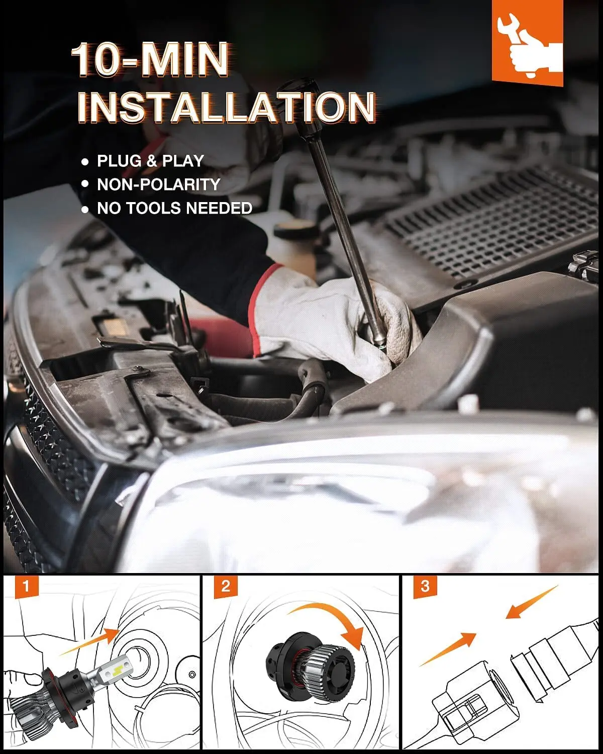 - 50,000 Hours Lifespan: A combination between aviation aluminum heat sink and 10,000RPM silent cooling fan design for optimal heat dissipation. An efficient cooling system speeds up heat dissipation to ensure 9008 LED headlight bulbs' superior performance and lifespan up to 50,000 hours.