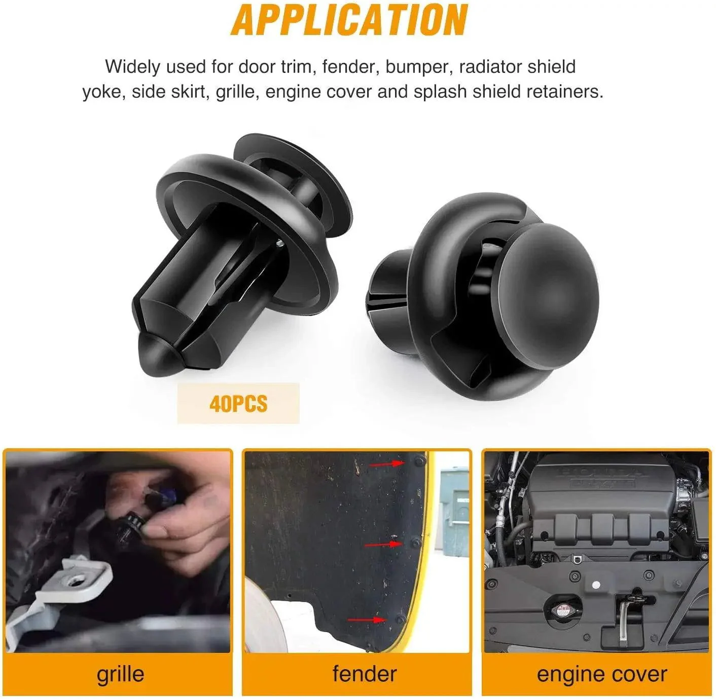 Commonly used for fitting side skirts, bumper, car fender, door trim panels, interior trim panels, and various trim panels.