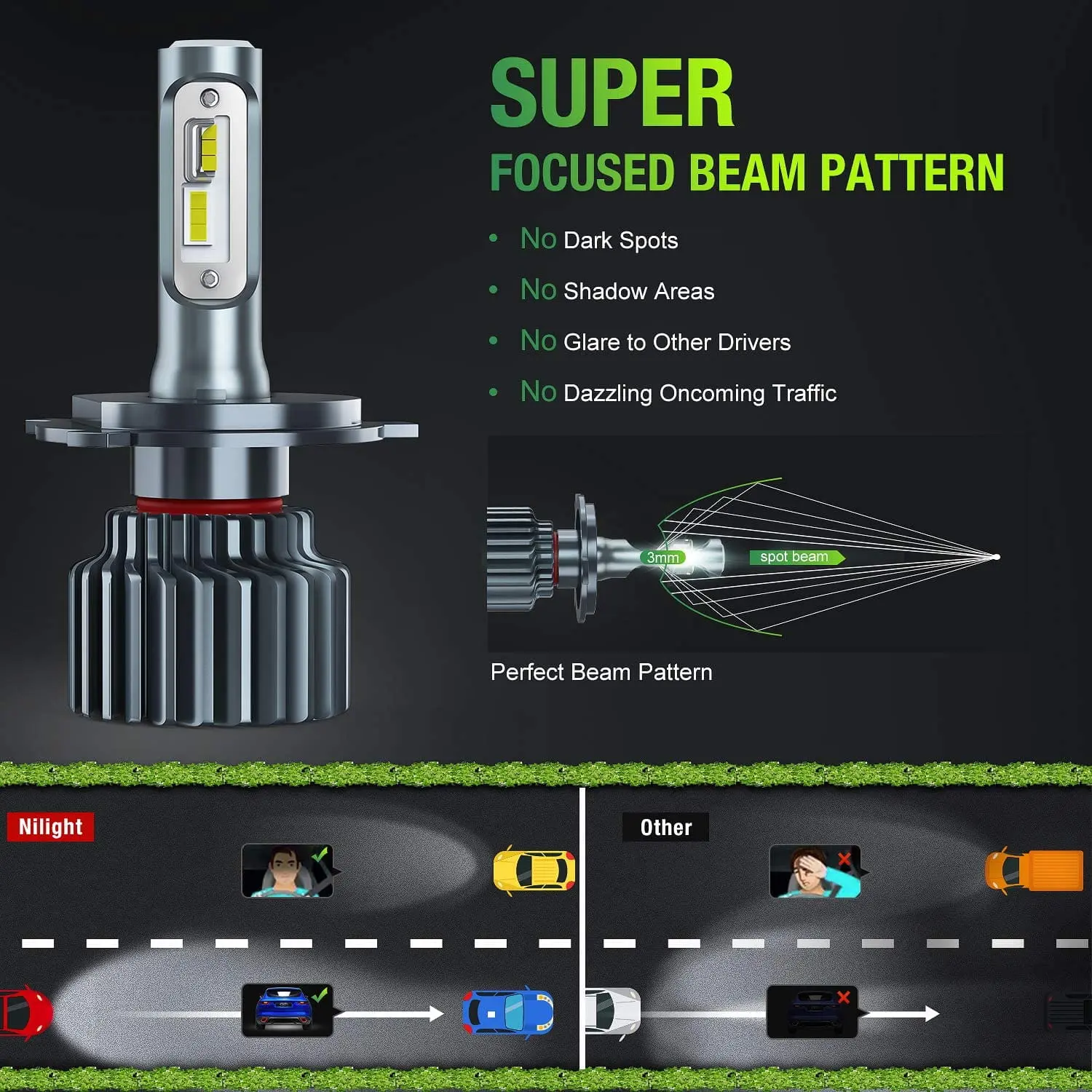 - 300% Brightness H4 LED Headlight Bulbs: 60W,10000 lumens per pair, 6000k cool white, Nilight headlight features customized CSP chips that effective lighting range can up to 500ft. Compared with halogen bulbs, 300% brightness and 55% energy saving. Super focused beam pattern without dark spot.