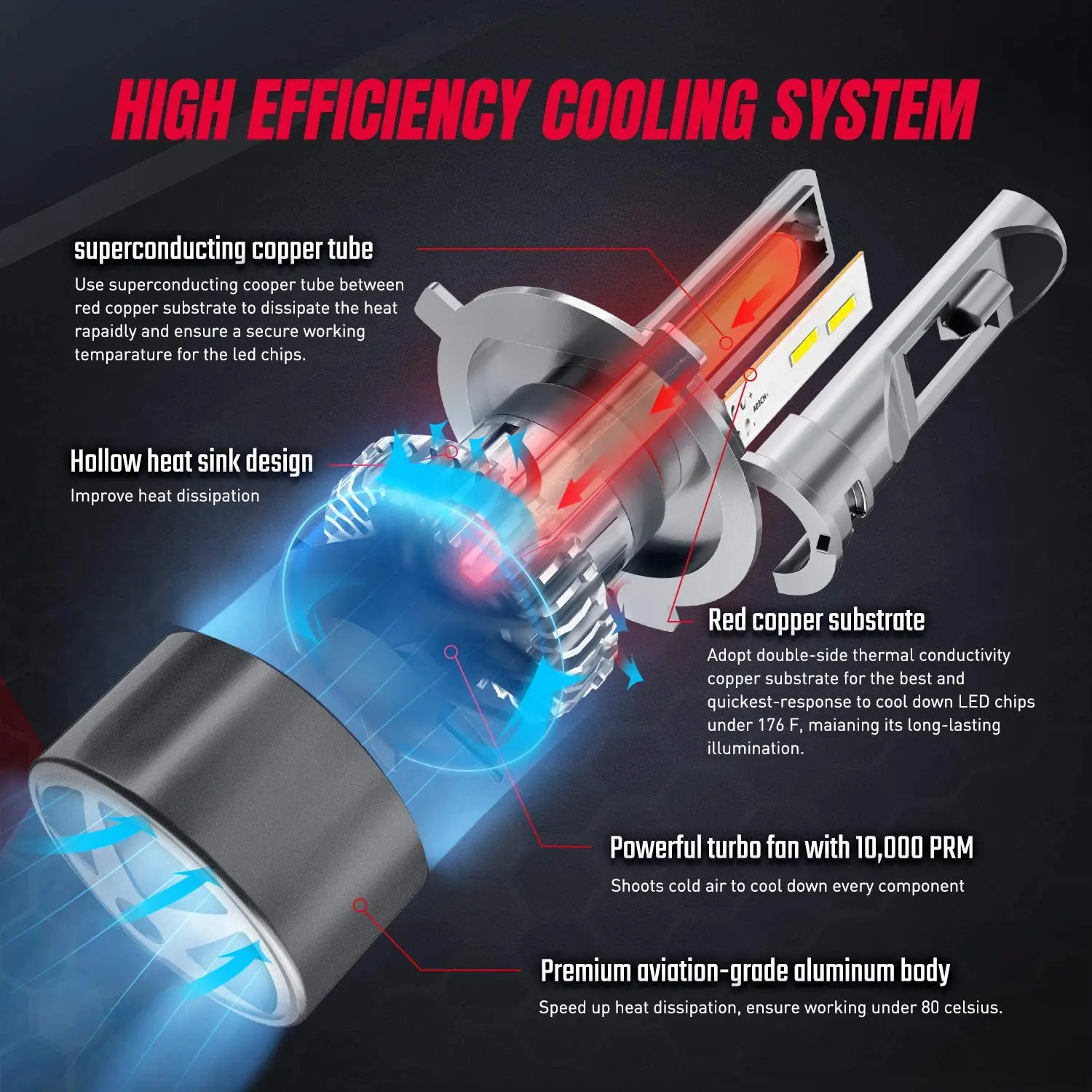 - Optimal cooling system & superior longevity: All in premium aviation aluminum body, combined with double-side thermal conductivity copper substrate technology, and built-in 10,000 PRM powerful turbofan for the highest efficient heat dissipation, extending a longer lifespan over 50,000 hours.